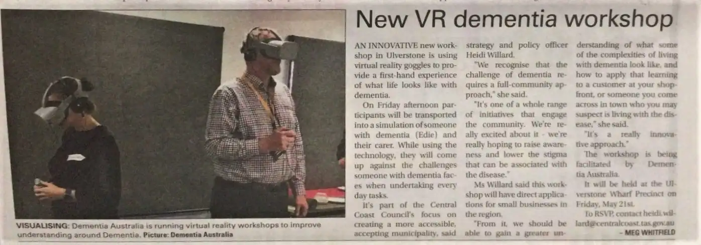 - See an article from Local Government Association Tasmania on the Dementia-Friendly Central Coast Award for Excellence 2019 win